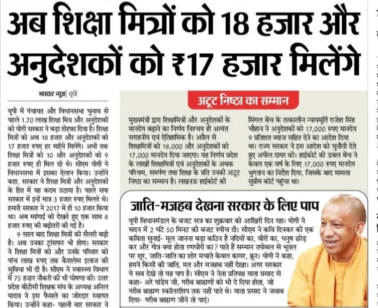 उत्तर प्रदेश मुख्यमंत्री योगी आदित्यनाथ जी ने ये ऐलान किया है की शिक्षा मित्रों और अनुदेशकों के लिए बड़ी राहत की खबर सामने आई है। राज्य सरकार द्वारा शिक्षा मित्रों के मानदेय में बढ़ोतरी करते हुए अब ₹18,000 प्रति माह देने का निर्णय लिया गया है। वहीं, अनुदेशकों को ₹17,000 प्रतिमाह मानदेय दिया अनुदेशकों को ₹17,000 प्रतिमाह मानदेय दिया जाएगा